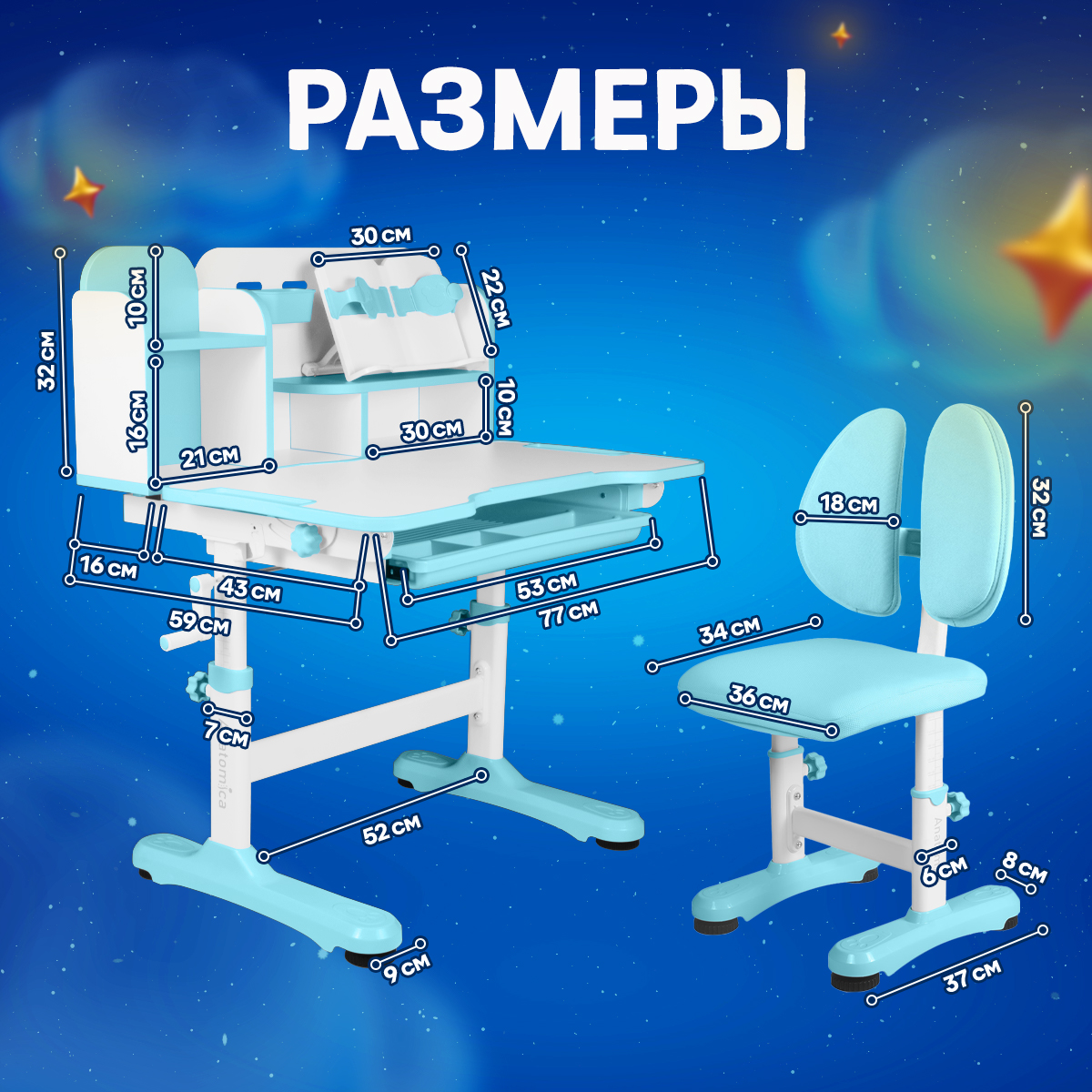 Также в комплекте есть растущий стул, который регулируется по высоте, и его спинка также регулируется по высоте и глубине. На ножках стола есть вспомогательная ростовая наклейка, она показывает соотношение роста ребенка с высотой стула и помогает подобрать нужную высоту. Прочный металлический каркас позволяет пользоваться партой длительное время. Комплект является эргономичным и помогает сохранять осанку ребенка здоровой.